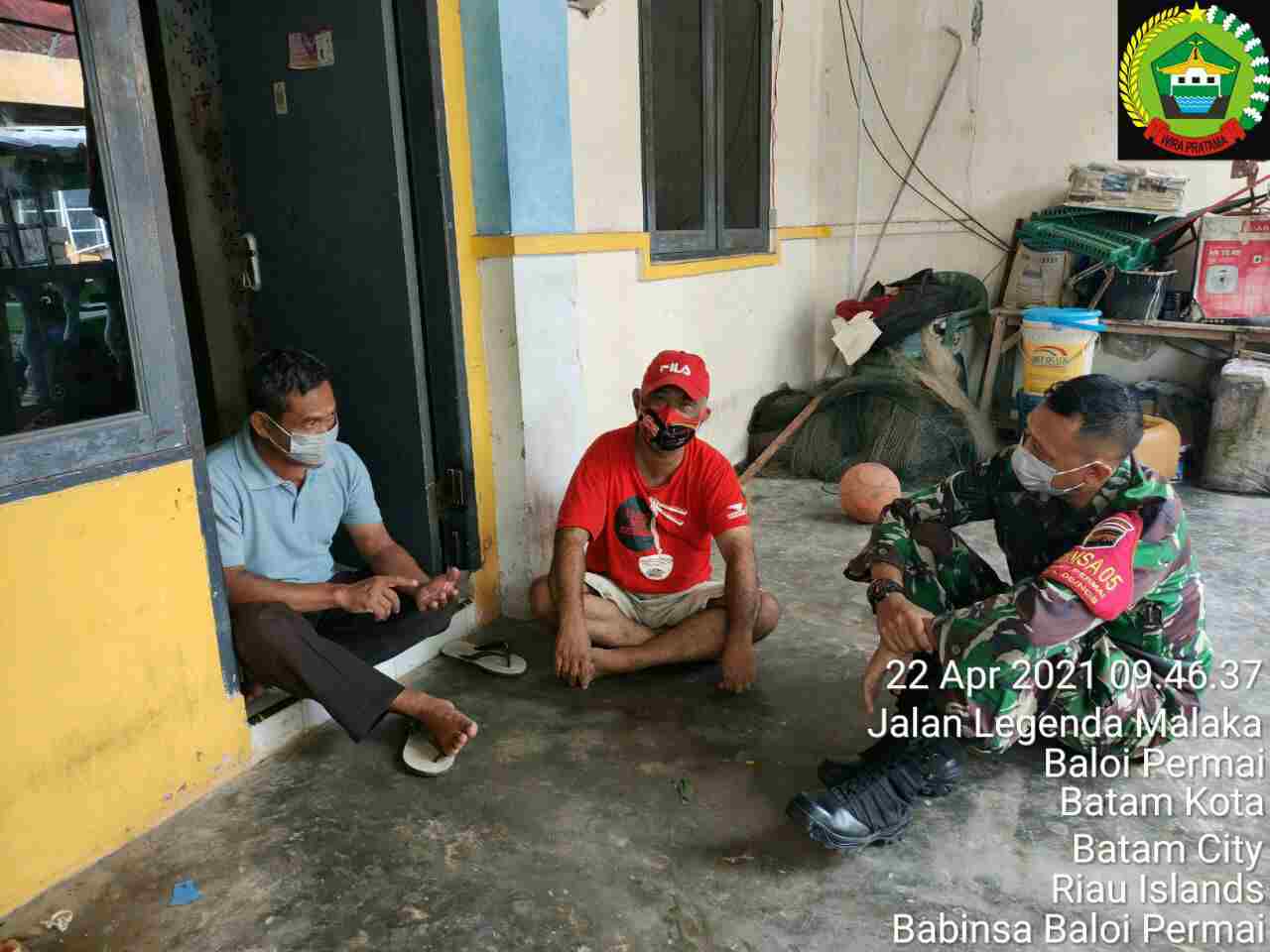Suaratoday.Com (BATAM) – Babinsa 05 Kelurahan Baloi Permai, Koramil 03/Nongsa, Kodim 0316/Batam, Sertu Suratmin Melaksanakan komsos penerapan pola kehidupan baru masa Pandemi Covid-19 bersama Ketua RT dan Tokoh Masyarakat di Pendopo rumah pak Farid yang beralamat di Legenda Malaka, Kel. Baloi Permai, Kec. Batam Kota. Kamis (22/04/2021).