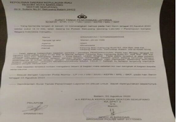 Atas kejadian tersebut, Erwinsyah mengalami luka lebam di pelipis mata kanan dan sudah melaporkan kejadian dialaminya ke Pihak Kepolisian Sektor (Polsek) Sekupang dengan bukti surat laporan Nomor : LP/112/VIII/2020/KEPRI/BRP/ SKP tentang pengaduan tindak pidana penganiayaan.
